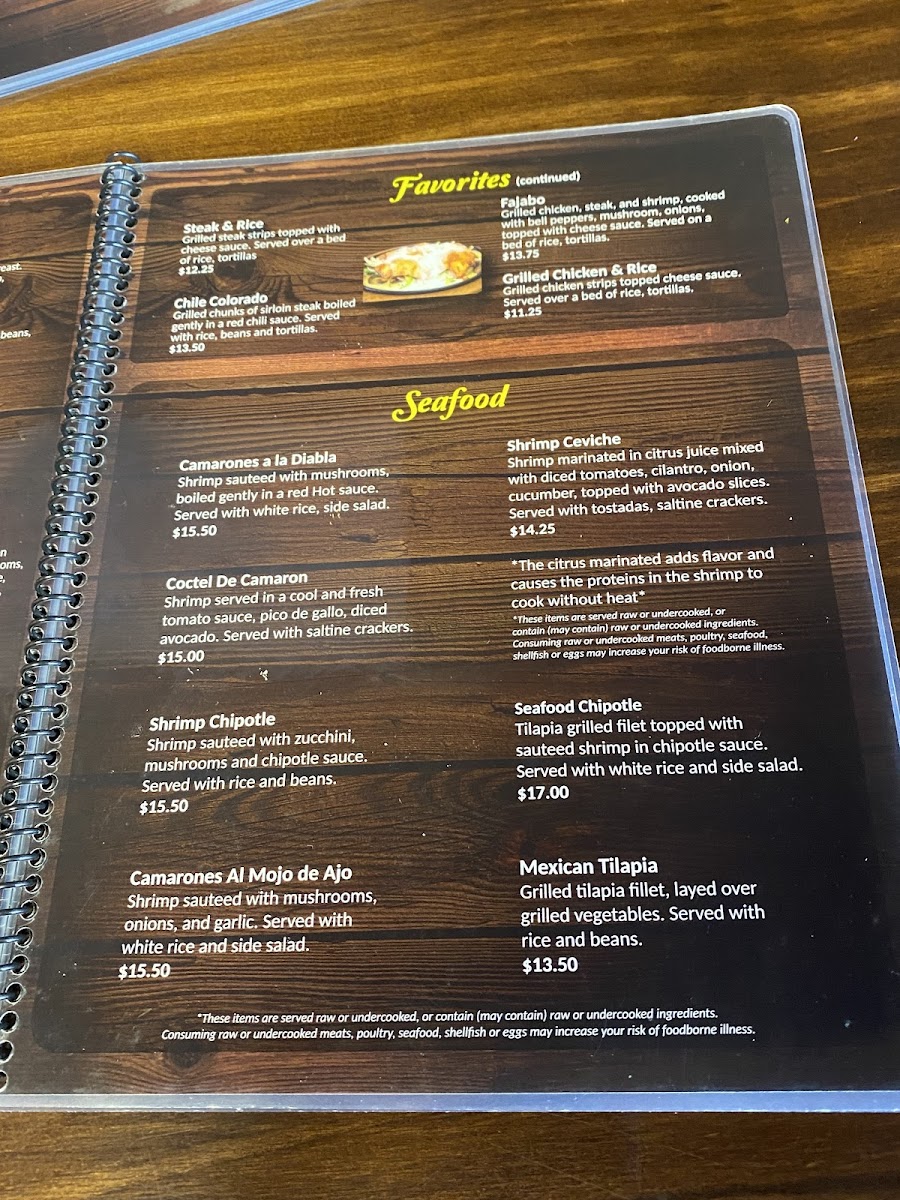 Ribeye steak, six shrimp, grilled chicken, chorizo, grilled onion (cebollita), grilled cactus, queso fresco, a special salsa, chiles toreados (fried jalapeños), served with rice, beans, lettuce, guacamole, sour cream, pico de gallo and tortillas.